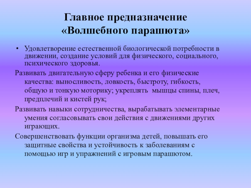 Совершенствовать функции организма детей, повышать его защитные свойства и устойчивость к заболеваниям с помощью игр и упражнений с игровым парашютом.
