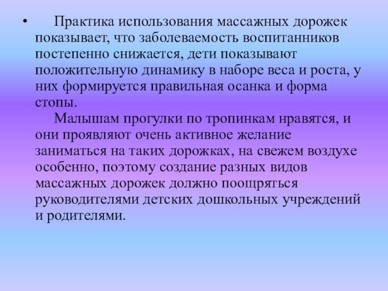 Слайд 10 Практика использования массажных дорожек показывает, что заболеваемость воспитанников