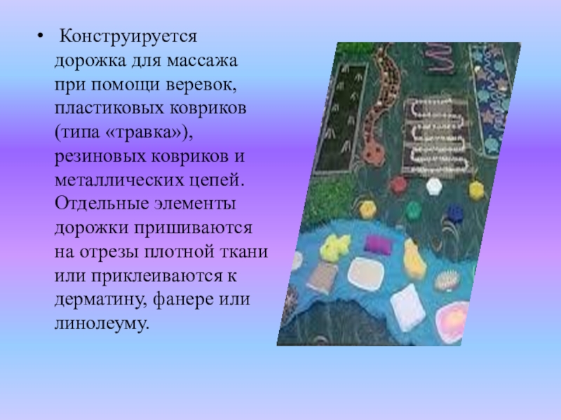 Слайд 7 Конструируется дорожка для массажа при помощи веревок, пластиковых ковриков (типа