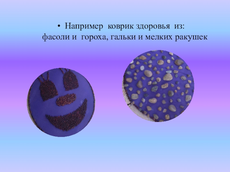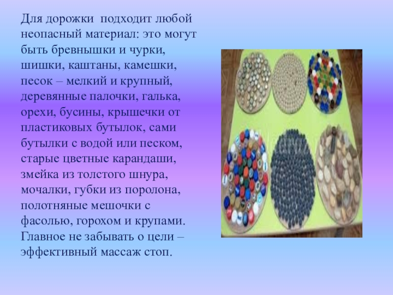 и чурки, шишки, каштаны, камешки, песок – мелкий и крупный, деревянные палочки, галька, орехи, бусины, крышечки от пластиковых бутылок, сами бутылки с водой или песком, старые цветные карандаши, змейка из толстого шнура, мочалки, губки из поролона, полотняные мешочки с фасолью, горохом и крупами. Главное не забывать о цели – эффективный массаж стоп.