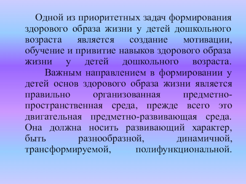 Важным направлением в формировании у детей основ здорового образа жизни является правильно организованная предметно-пространственная среда, прежде всего это двигательная предметно-развивающая среда. Она должна носить развивающий характер, быть разнообразной, динамичной, трансформируемой, полифункциональной.