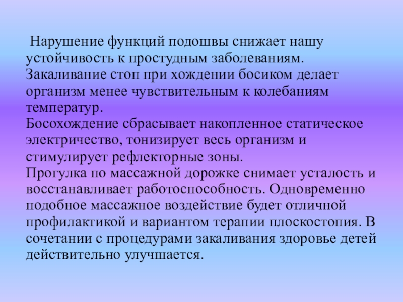стоп при хождении босиком делает организм менее чувствительным к колебаниям температур.