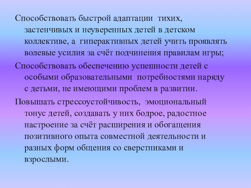Слайд 13Способствовать быстрой адаптации тихих, застенчивых и неуверенных детей в детском коллективе,
