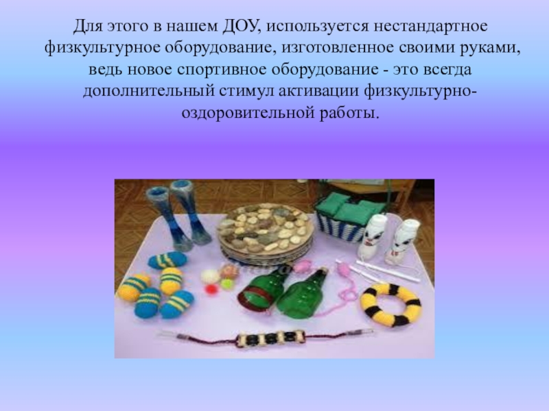 Слайд 3Для этого в нашем ДОУ, используется нестандартное физкультурное оборудование, изготовленное своими