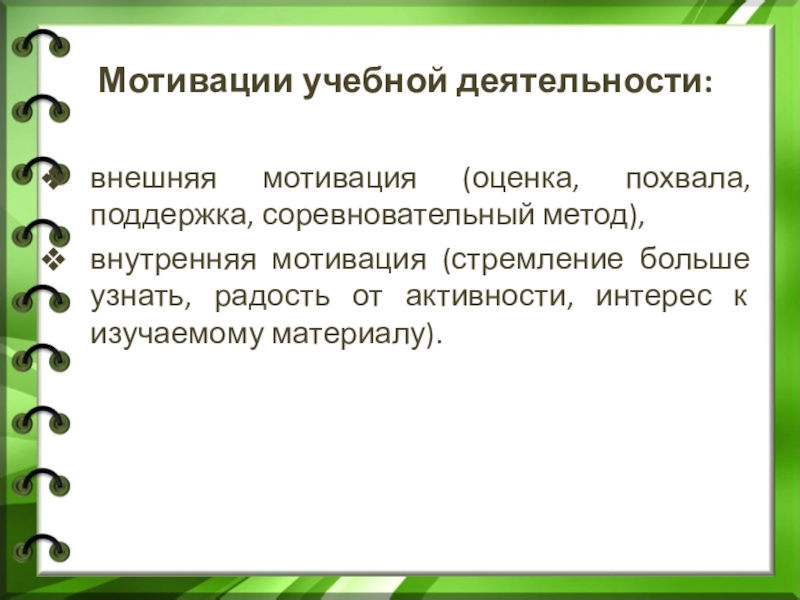 внешняя мотивация (оценка, похвала, поддержка, соревновательный метод),
