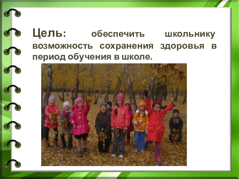 Слайд 3Цель: обеспечить школьнику возможность сохранения здоровья в период обучения в школе.