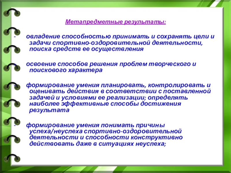 - формирование умения понимать причины успеха/неуспеха спортивно-оздоровительной деятельности и способности конструктивно действовать даже в ситуациях неуспеха;
