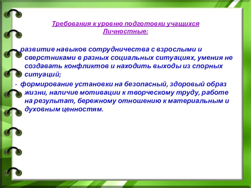 - формирование установки на безопасный, здоровый образ жизни, наличие мотивации к творческому труду, работе на результат, бережному отношению к материальным и духовным ценностям.