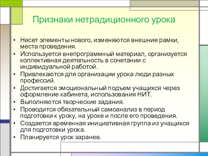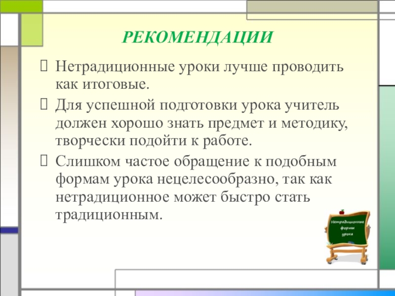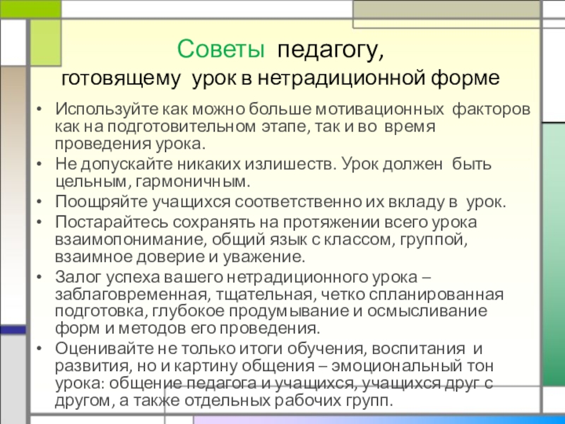 Залог успеха вашего нетрадиционного урока – заблаговременная, тщательная, четко спланированная подготовка, глубокое продумывание и осмысливание форм и методов его проведения.