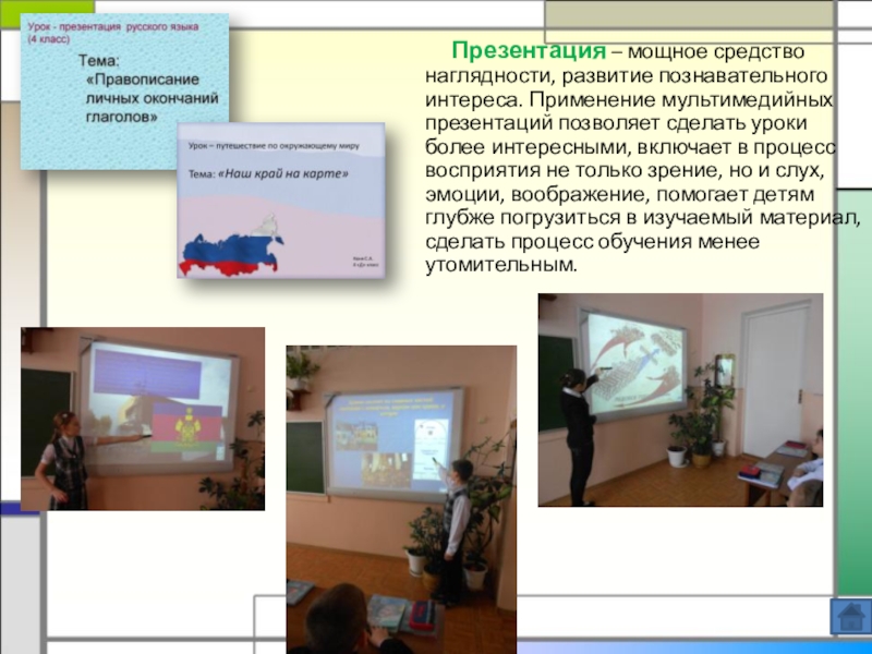 развитие познавательного интереса. Применение мультимедийных презентаций позволяет сделать уроки более интересными, включает в процесс восприятия не только зрение, но и слух, эмоции, воображение, помогает детям глубже погрузиться в изучаемый материал, сделать процесс обучения менее утомительным.