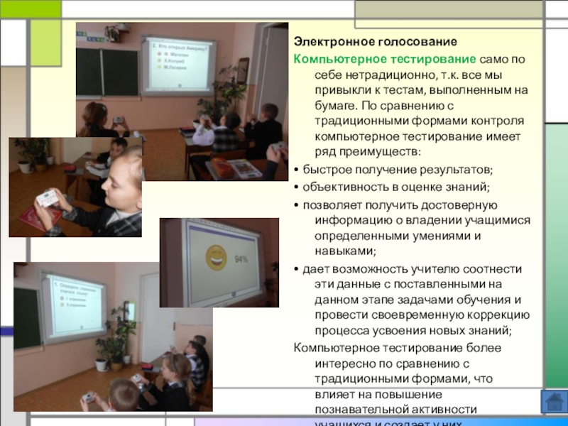 Компьютерное тестирование более интересно по сравнению с традиционными формами, что влияет на повышение познавательной активности учащихся и создает у них положительную мотивацию.
