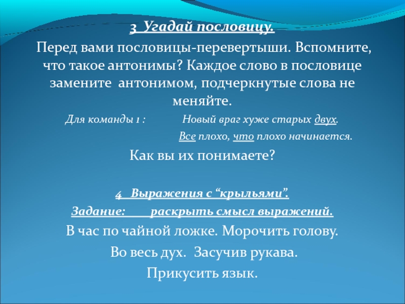 Перед вами пословицы-перевертыши. Вспомните, что такое антонимы? Каждое