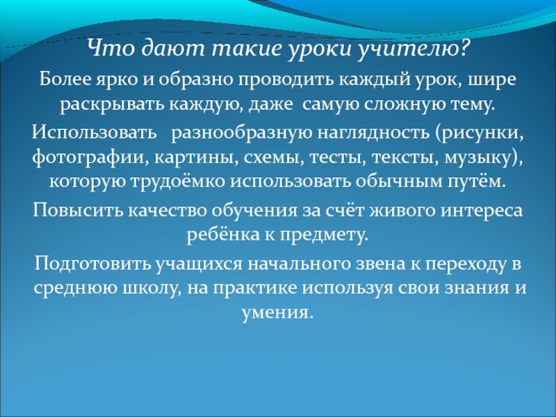 Использовать разнообразную наглядность (рисунки, фотографии, картины, схемы, тесты, тексты, музыку), которую трудоёмко использовать обычным путём.