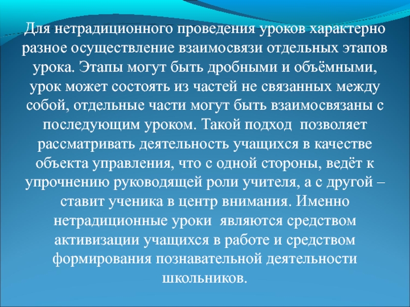 Этапы могут быть дробными и объёмными, урок может состоять из частей не связанных между собой, отдельные части могут быть взаимосвязаны с последующим уроком. Такой подход позволяет рассматривать деятельность учащихся в качестве объекта управления, что с одной стороны, ведёт к упрочнению руководящей роли учителя, а с другой – ставит ученика в центр внимания. Именно нетрадиционные уроки являются средством активизации учащихся в работе и средством формирования познавательной деятельности школьников.