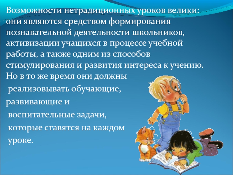 Слайд 5Возможности нетрадиционных уроков велики: они являются средством формирования познавательной деятельности школьников,