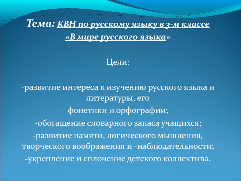 Слайд 14Тема: КВН по русскому языку в 3-м классе