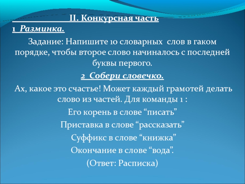 Ах, какое это счастье! Может каждый грамотей делать слово из частей. Для команды 1 :