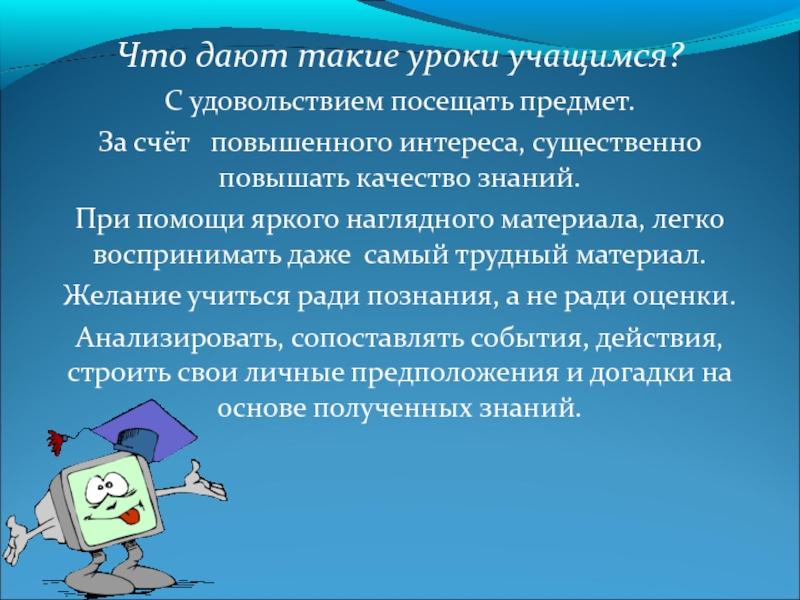 - обеспечивает высокую степень дифференциации обучения ( индивидуально подойти к ученику, применяя разноуровневые задания).