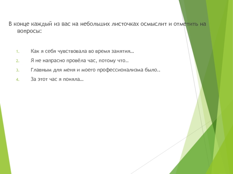 Слайд 17В конце каждый из вас на небольших листочках осмыслит и отметить