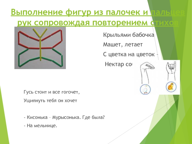 Слайд 13Выполнение фигур из палочек и пальцев рук сопровождая повторением стихов