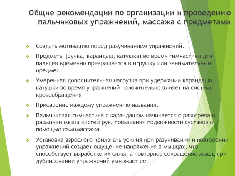 Слайд 5Общие рекомендации по организации и проведению пальчиковых упражнений, массажа с предметами