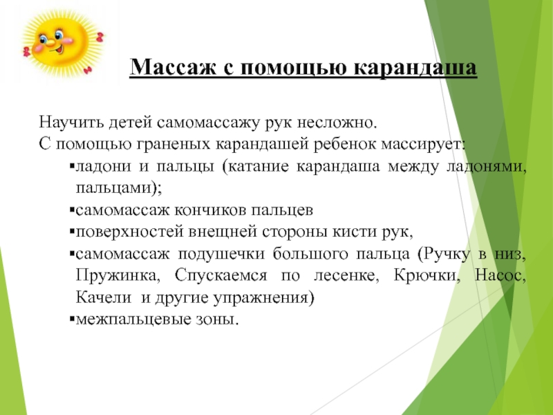 Пальчиковая гимнастика с карандашом начинается с разогрева и разминки мышц кистей рук, повышения подвижности суставов с помощью самомассажа.