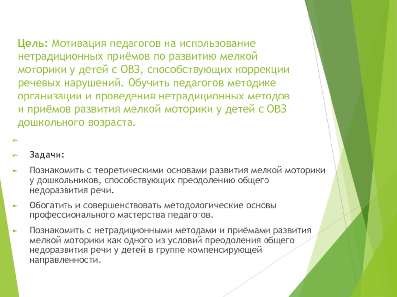 у детей с ОВЗ, способствующих коррекции речевых нарушений. Обучить педагогов методике организации и проведения нетрадиционных методов и приёмов развития мелкой моторики у детей с ОВЗ дошкольного возраста.
