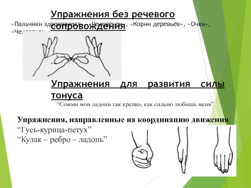 «Пальчики здороваются», «Человечек», «Корни деревьев», «Очки», «Человечек»