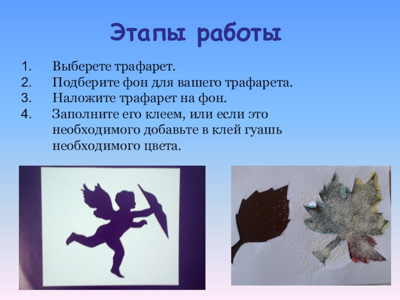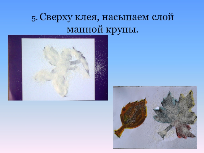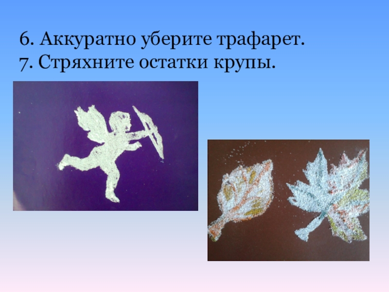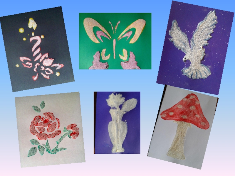Дошкольникам старшего возраста интересно работать с манкой получаются интересные картины и ночные и зимние пейзажи, а также для них очень увлекательна работа с трафаретами. Во время работы в данной технике совершенствуется мелкая моторика рук, развивается творческое воображение.