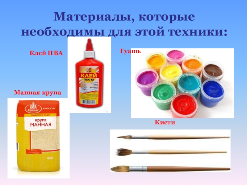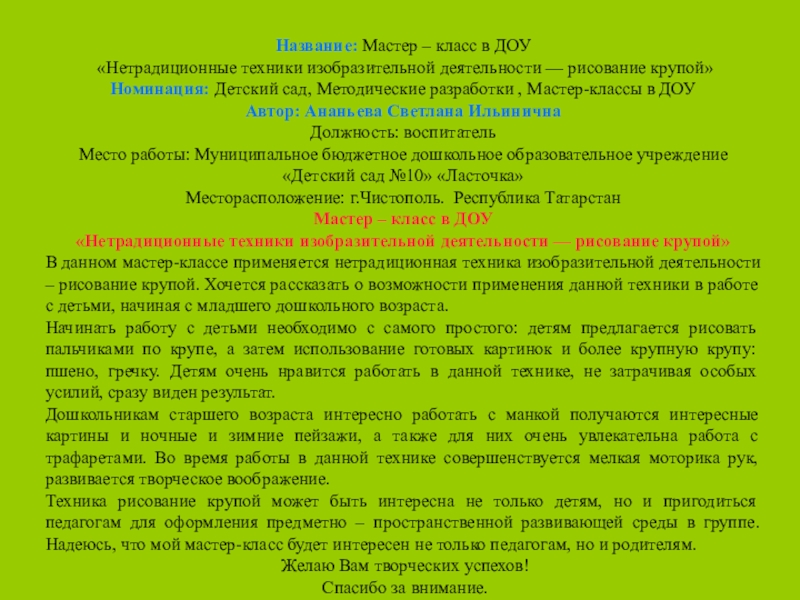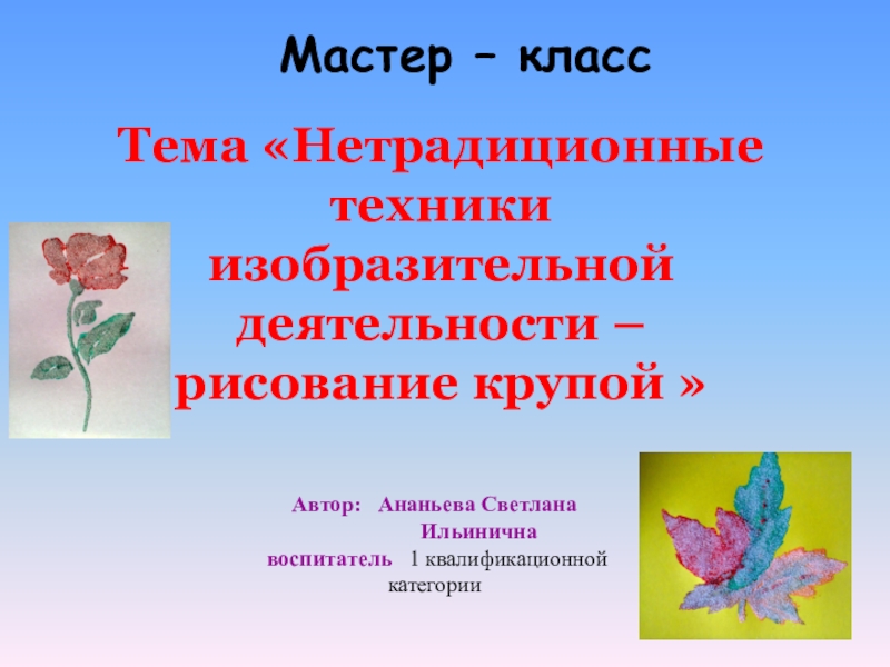 В данном мастер-классе применяется нетрадиционная техника изобразительной деятельности – рисование крупой. Хочется рассказать о возможности применения данной техники в работе с детьми, начиная с младшего дошкольного возраста.