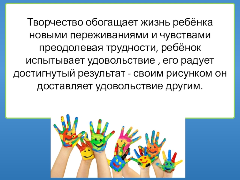 Творчество обогащает жизнь ребёнка новыми переживаниями и чувствамипреодолевая трудности, ребёнок испытывает удовольствие , его радует достигнутый результат