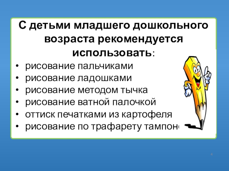 С детьми младшего дошкольного возраста рекомендуется использовать:рисование пальчикамирисование ладошкамирисование методом тычкарисование ватной палочкойоттиск печатками из картофелярисование по