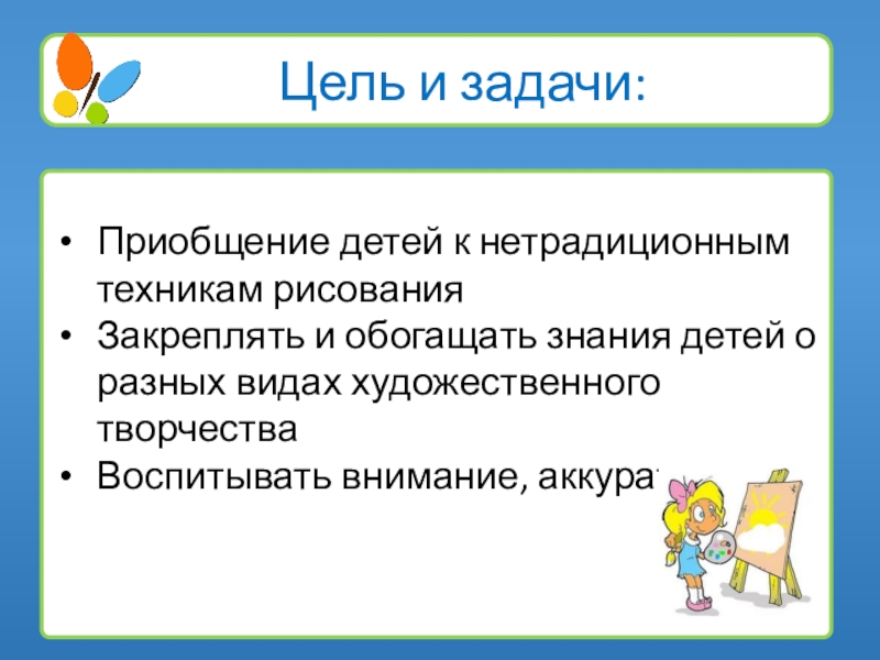 Цель и задачи:Приобщение детей к нетрадиционным техникам рисованияЗакреплять и обогащать знания детей о разных видах художественного  творчестваВоспитывать внимание, аккуратность