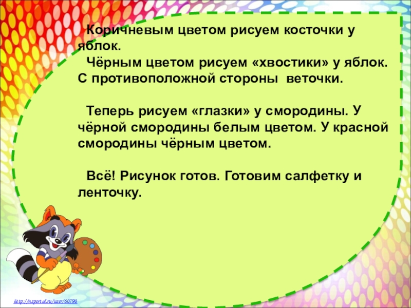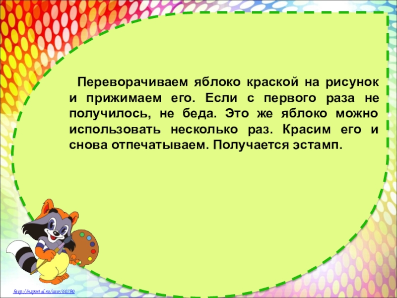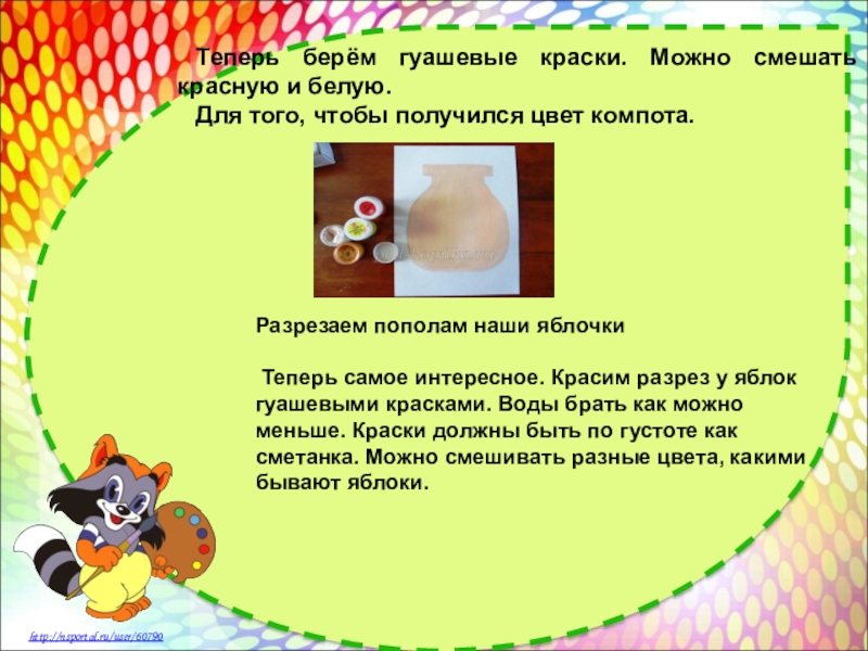 Теперь самое интересное. Красим разрез у яблок гуашевыми красками. Воды брать как можно меньше. Краски должны быть по густоте как сметанка. Можно смешивать разные цвета, какими бывают яблоки.