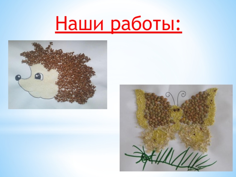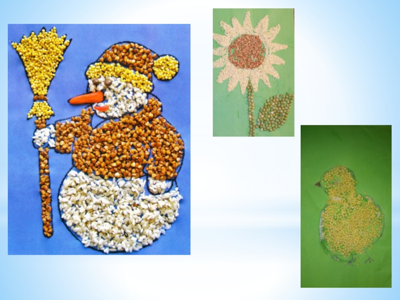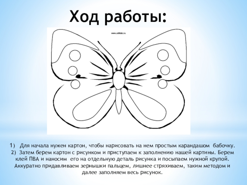 2) Затем берем картон с рисунком и приступаем к заполнению нашей картины. Берем клей ПВА и наносим его на отдельную деталь рисунка и посыпаем нужной крупой. Аккуратно придавливаем зернышки пальцем, лишнее стряхиваем, таким методом и далее заполняем весь рисунок.