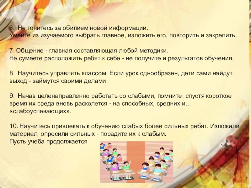 10. Научитесь привлекать к обучению слабых более сильных ребят. Изложили материал, опросили сильных - посадите их к слабым.