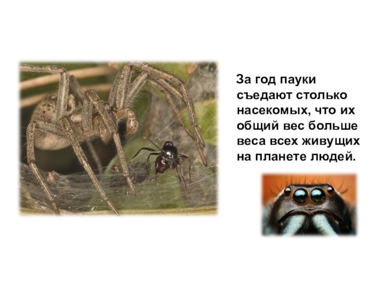 Слайд 5 За год пауки съедают столько насекомых, что их общий