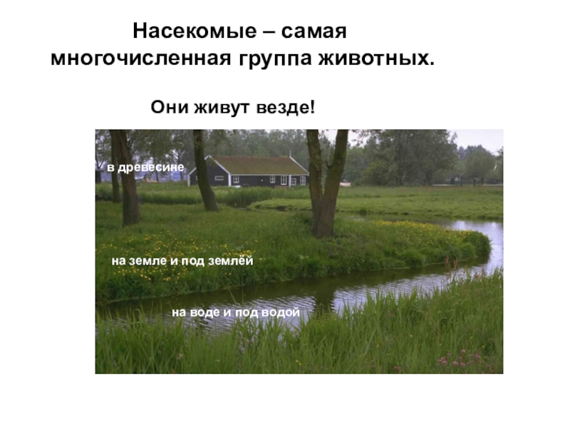 Насекомые – самая  многочисленная группа животных.Они живут везде!на воде и под водойв древесинена земле и под