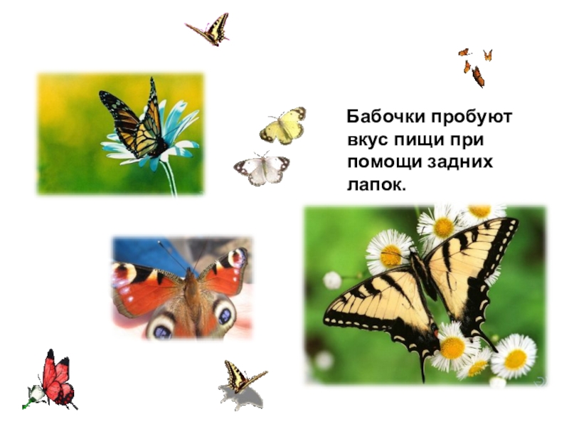 Слайд 7 Бабочки пробуют вкус пищи при помощи задних лапок.