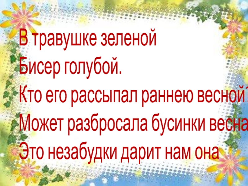 В травушке зеленой Бисер голубой. Кто его рассыпал раннею весной? Может разбросала бусинки весна? Это незабудки дарит