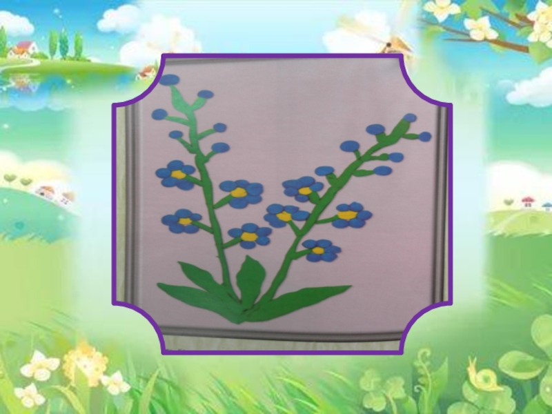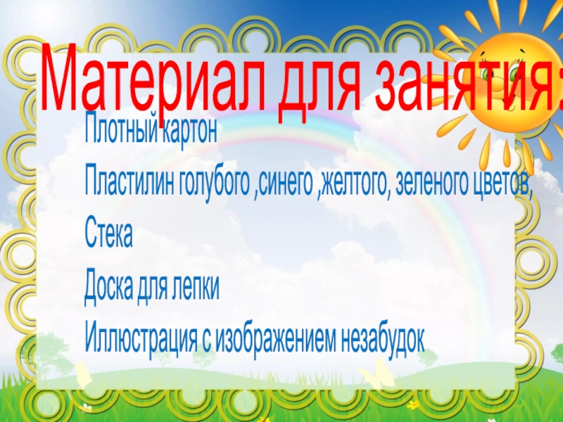 Материал для занятия:Плотный картонПластилин голубого ,синего ,желтого, зеленого цветов,СтекаДоска для лепкиИллюстрация с изображением незабудок