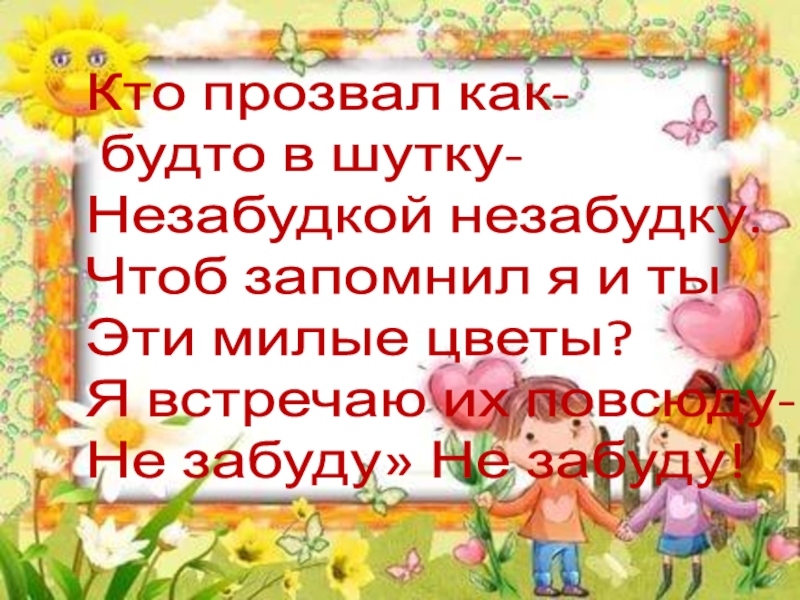 Слайд 4Кто прозвал как- будто в шутку- Незабудкой незабудку. Чтоб запомнил я и ты Эти