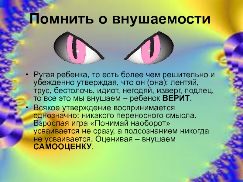 Всякое утверждение воспринимается однозначно: никакого переносного смысла. Взрослая игра «Понимай наоборот» усваивается не сразу, а подсознанием никогда не усваивается. Оценивая – внушаем САМООЦЕНКУ.