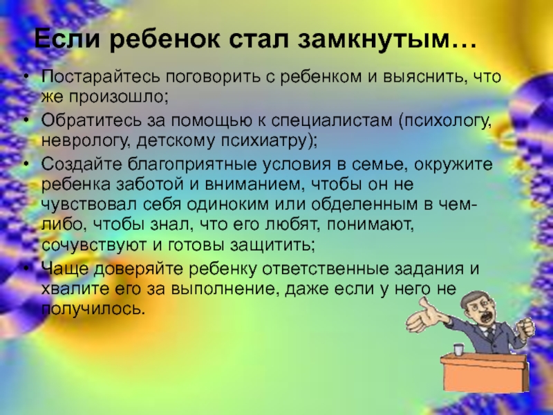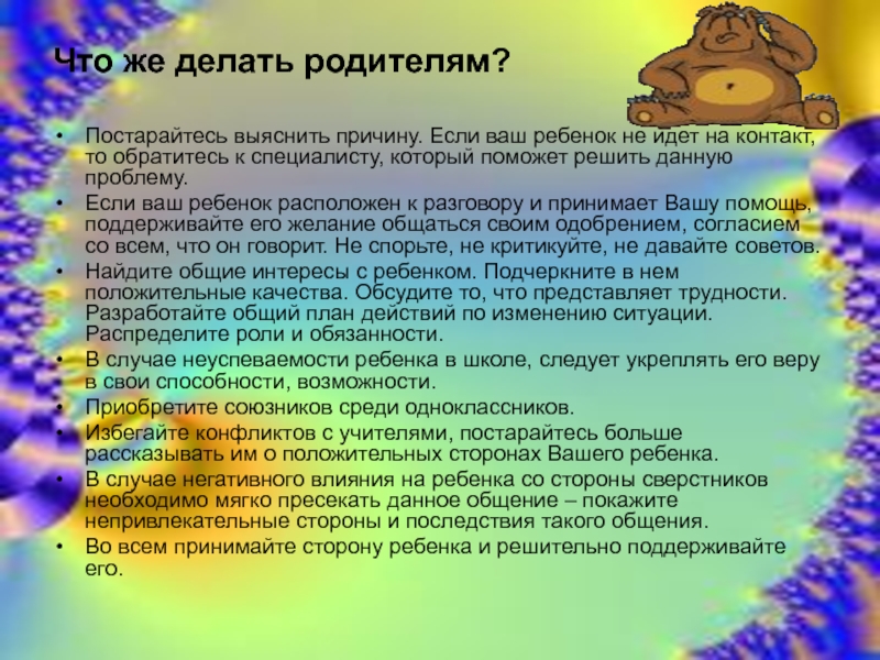 Избегайте конфликтов с учителями, постарайтесь больше рассказывать им о положительных сторонах Вашего ребенка.