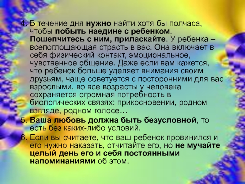 наедине с ребенком. Пошепчитесь с ним, приласкайте. У ребенка – всепоглощающая страсть в вас. Она включает в себя физический контакт, эмоциональное, чувственное общение. Даже если вам кажется, что ребенок больше уделяет внимания своим друзьям, чаще советуется с посторонними для вас взрослыми, во все возрасты у человека сохраняется огромная потребность в биологических связях: прикосновении, родном взгляде, родном голосе…
