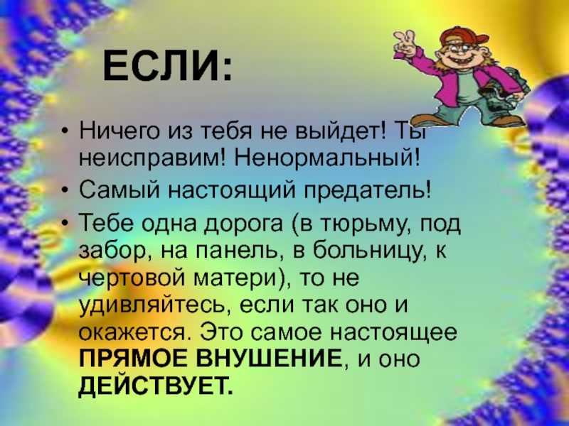 дорога (в тюрьму, под забор, на панель, в больницу, к чертовой матери), то не удивляйтесь, если так оно и окажется. Это самое настоящее ПРЯМОЕ ВНУШЕНИЕ, и оно ДЕЙСТВУЕТ.
