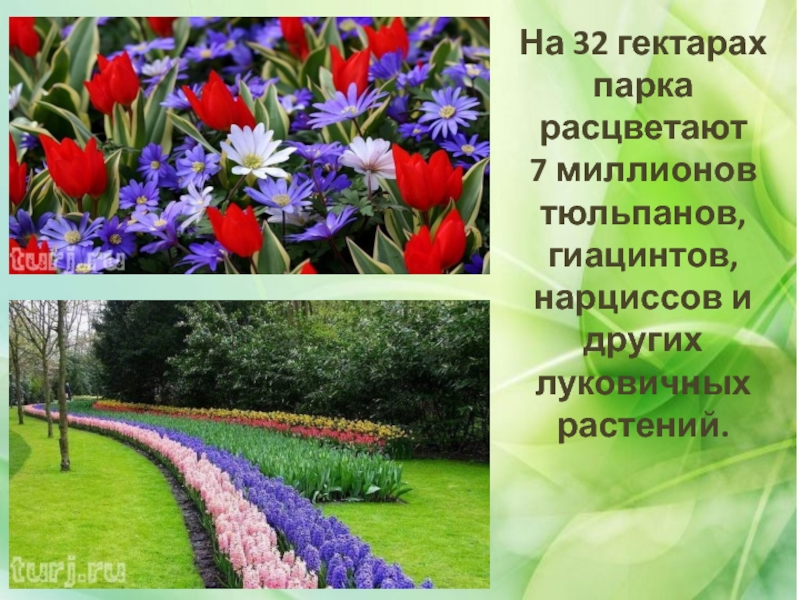 .. На 32 гектарах парка расцветают 7 миллионов тюльпанов, гиацинтов, нарциссов и других луковичных растений.