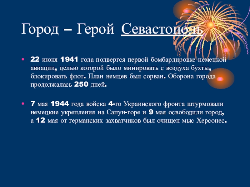 авиации, целью которой было минировать с воздуха бухты, блокировать флот. План немцев был сорван. Оборона города продолжалась 250 дней.