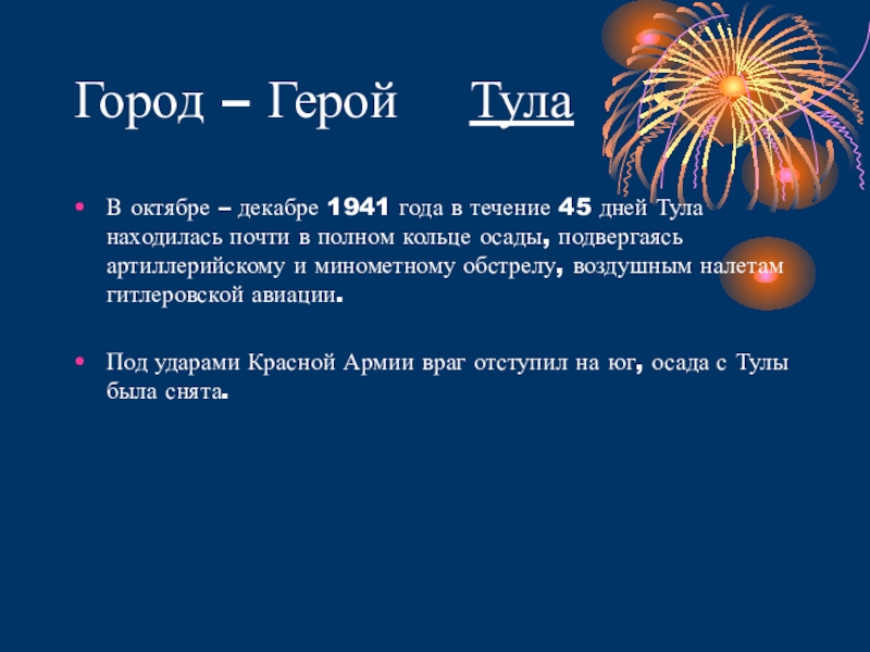 течение 45 дней Тула находилась почти в полном кольце осады, подвергаясь артиллерийскому и минометному обстрелу, воздушным налетам гитлеровской авиации.