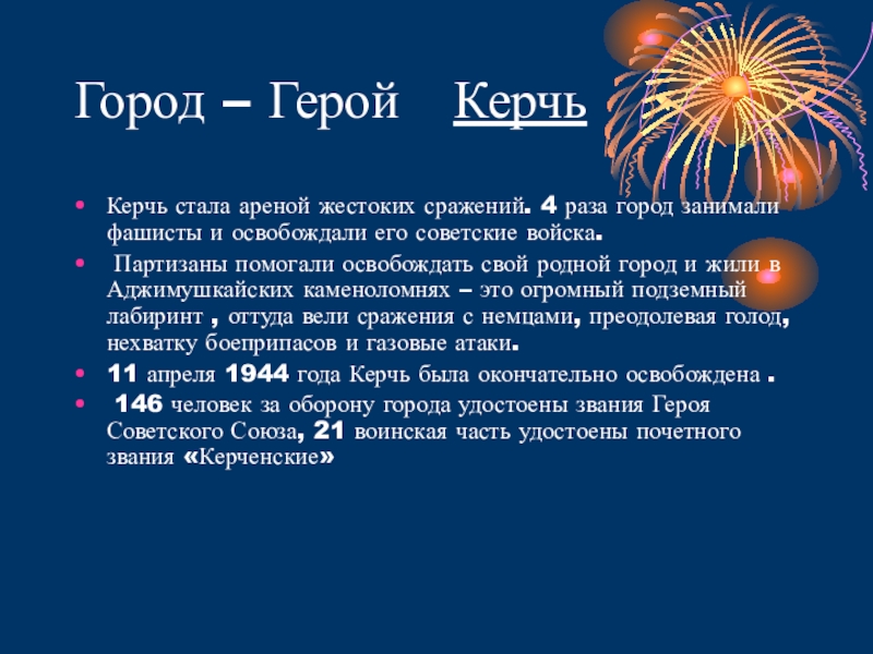 Партизаны помогали освобождать свой родной город и жили в Аджимушкайских каменоломнях – это огромный подземный лабиринт , оттуда вели сражения с немцами, преодолевая голод, нехватку боеприпасов и газовые атаки.